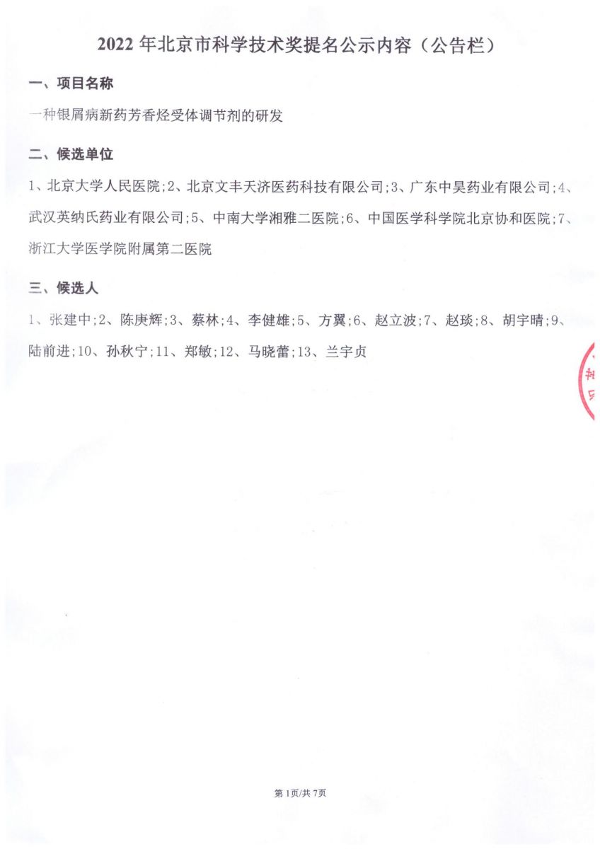 關于提名2022年度北京市科學技術獎項目 公示